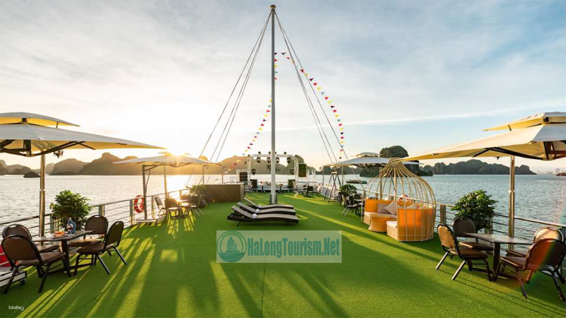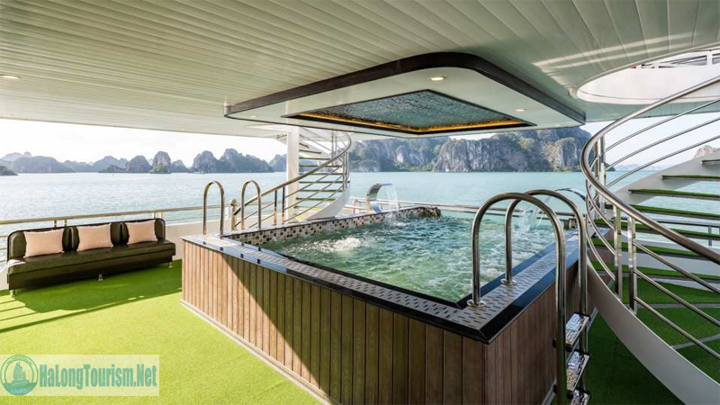 - Boong tàu rộng rãi với khu vực tắm nắng, quầy bar ngoài trời và bể sục Jacuzzi – lý tưởng để thư giãn và ngắm hoàng hôn.
